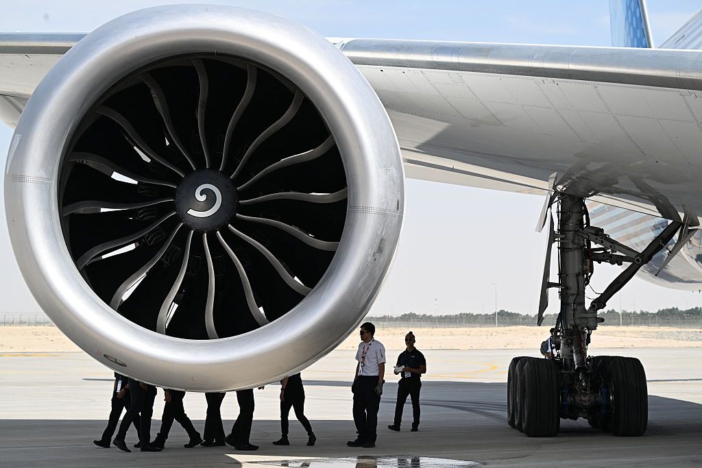 Technicians inspect an engine of a Boeing 777-9 before takeoff at Al-Maktoum International Airport