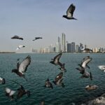 A flock of pigeons flies along a promenade overlooking the Abu Dhabi skyline