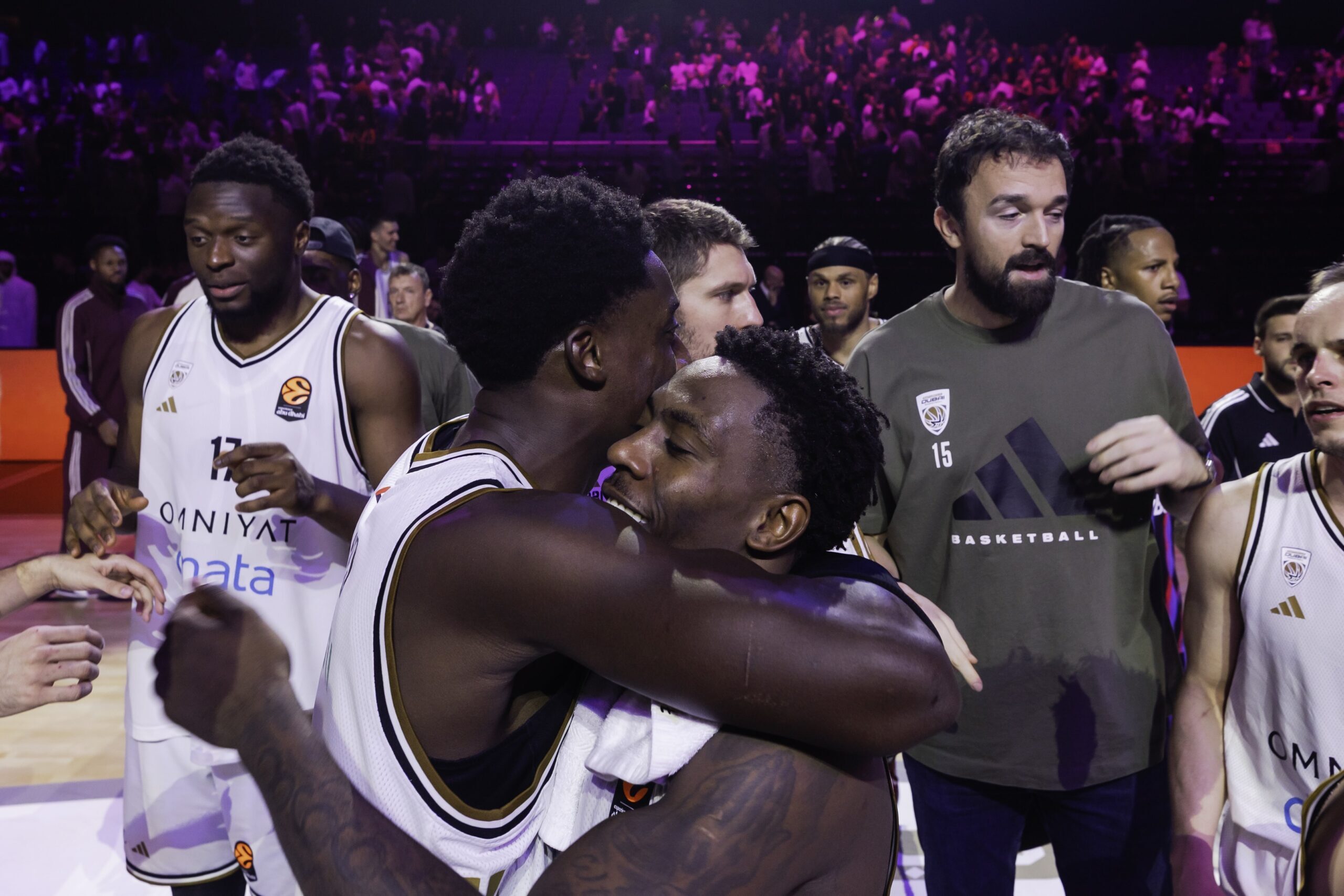 Members of the Dubai Basketball team celebrate after their 90-89 victory in the EuroLeague Round 13 match against Paris Basketball at Coca-Cola Arena in Dubai on Tuesday. (Charles Verghese/Euroleague Basketball via Getty Images)