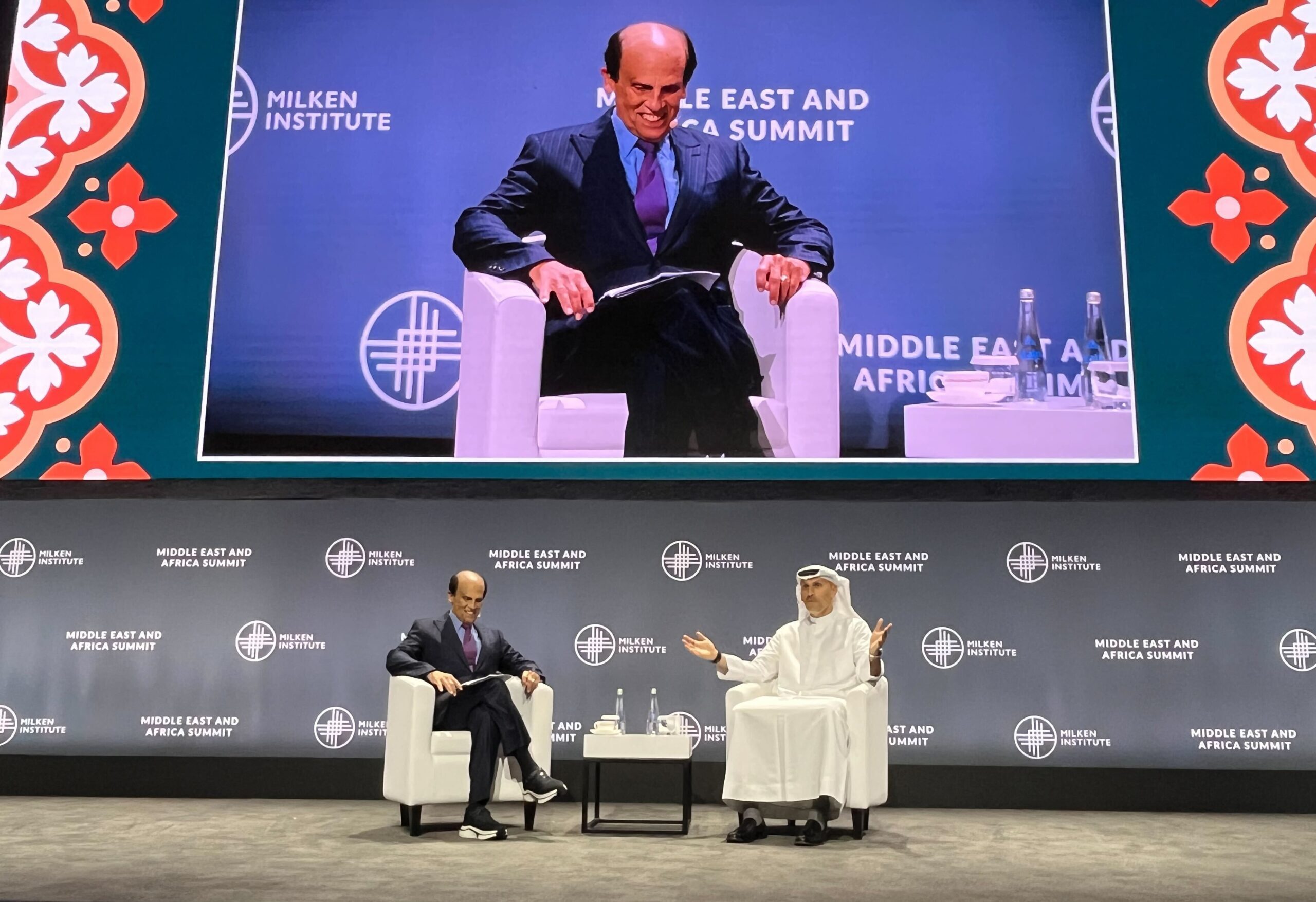 Michael Milken in conversation with Khaldoon Al Mubarak, Group CEO and Managing Director of the Mubadala sovereign wealth fund and Chairman of Abu Dhabiās Executive Affairs Authority at the Milken Summit in Abu Dhabi. (Omnia Al Desoukie / The Circuit)