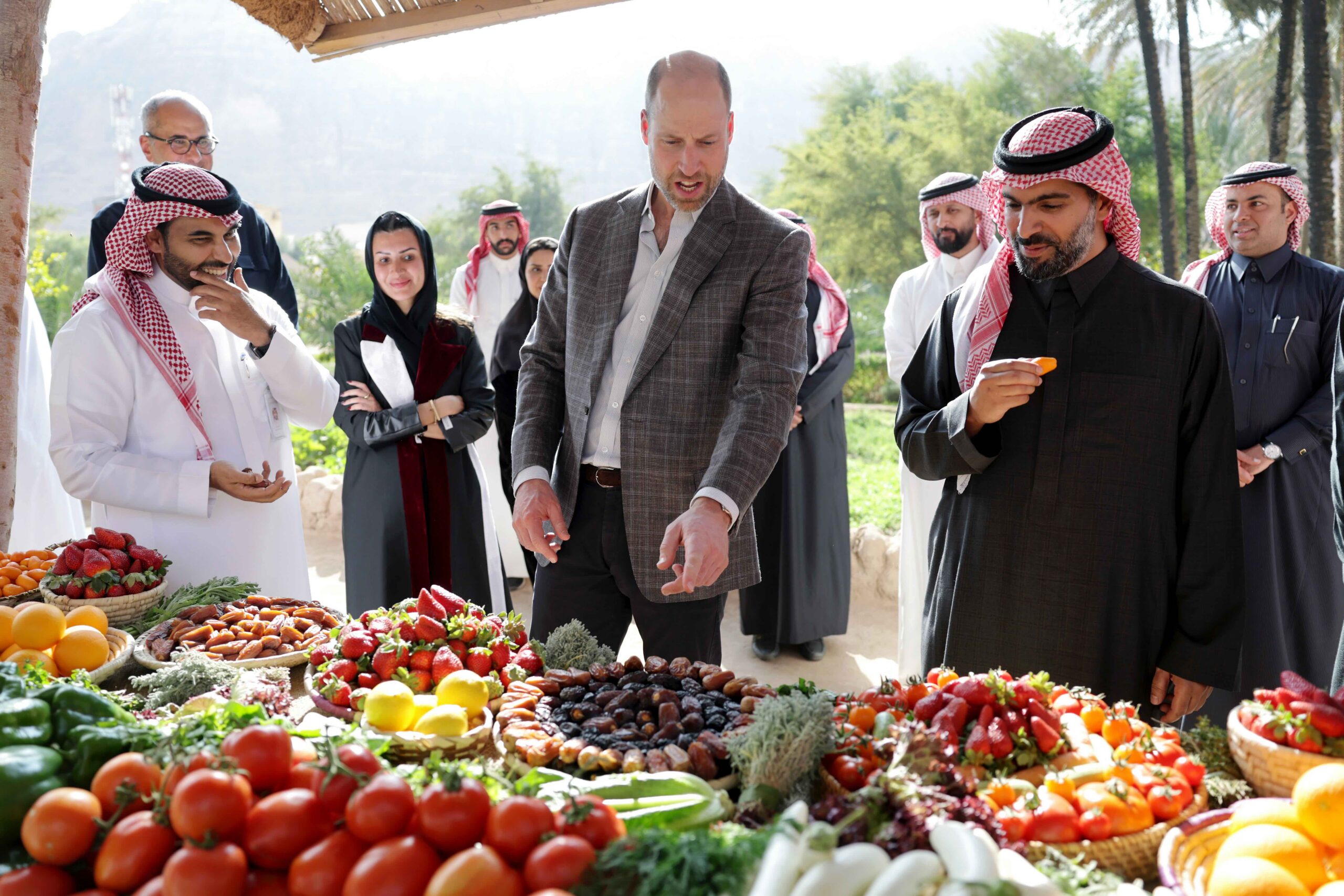 Britain’s Prince William and Saudi Arabia’s Prince Badr bin Abdullah bin Farhan inspect produce at the AlUla Oasis on Wednesday. (Chris Jackson/Getty Images)