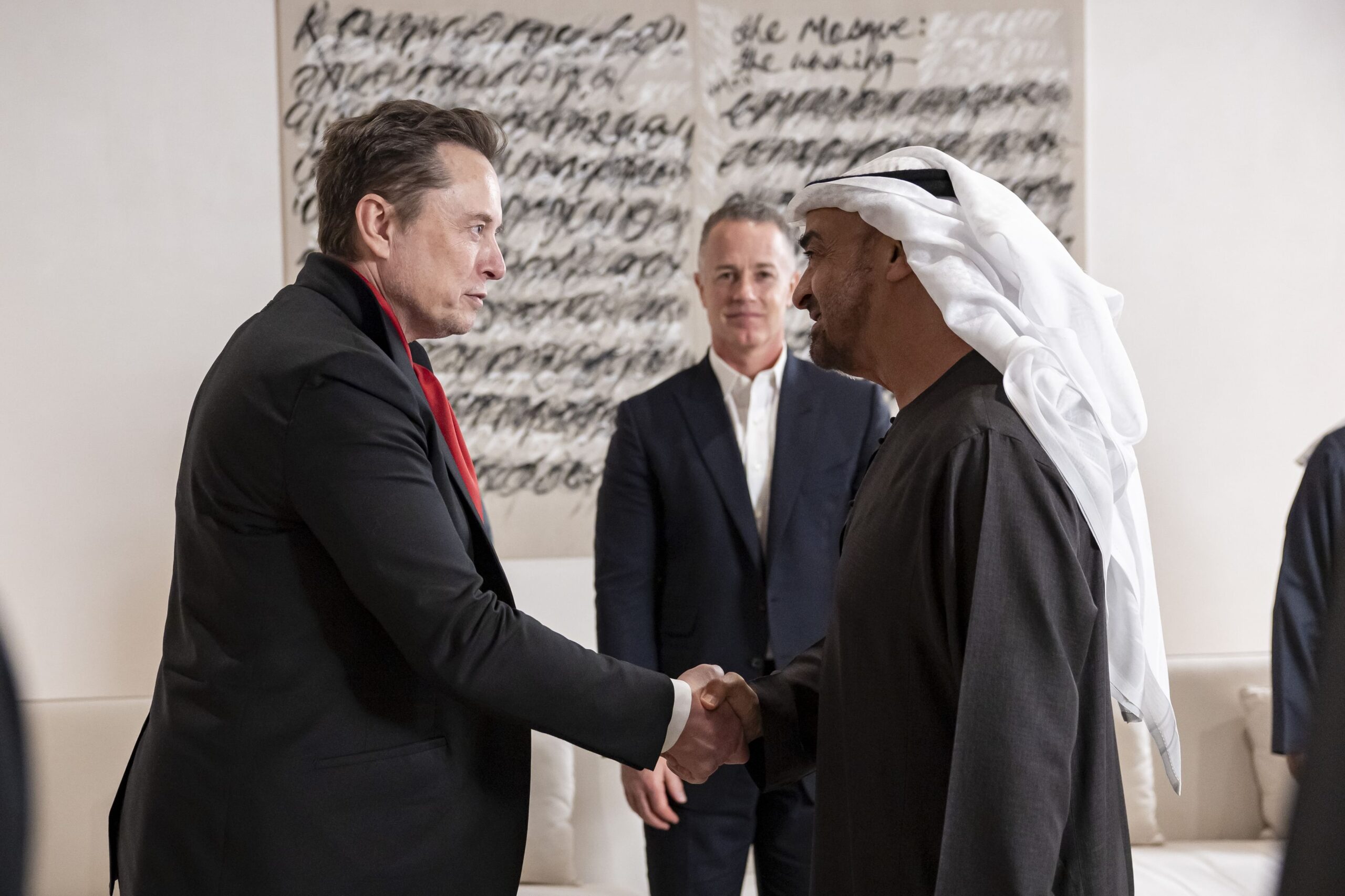 Sheikh Mohammed bin Zayed, President of the UAE, met with Tesla founder Elon Musk on Sunday in Abu Dhabi, where they discussed artificial intelligence and other advanced technologies. Also attending the meeting were Sheikh Tahnoun bin Zayed, the National Security Advisor and Chairman of sovereign wealth funds ADIA and ADQ;. Sheikh Khaled bin Mohammed, Crown Prince of Abu Dhabi and Chairman of the Abu Dhabi Executive Council; and Sheikh Hamdan bin Mohammed, Crown Prince of Dubai and UAE Minister of Defense (Emirates News Agency)