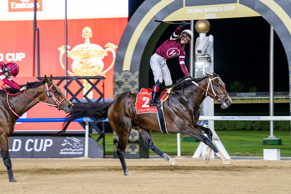 Magnitude, ridden by Jose Ortiz, beat Forever Young to win the $12 million Dubai World Cup on Saturday at Meydan Racecourse (FBM Media/Getty Images)